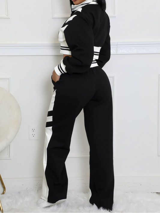Contrast Color Zip-up Jacket & Solid Color Flared Trousers Set