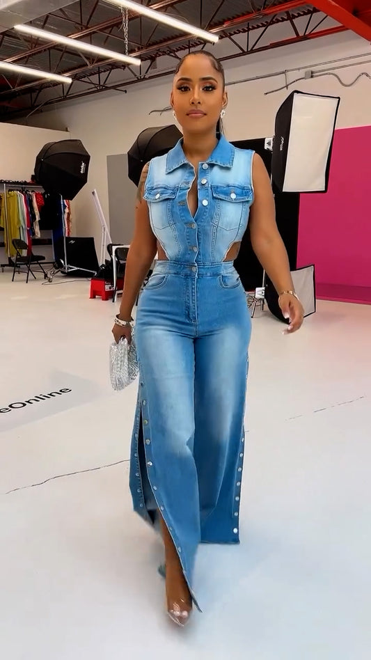Snap It Out Wide Leg Denim Jumpsuit