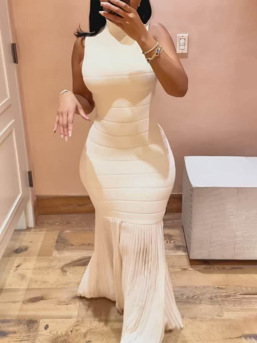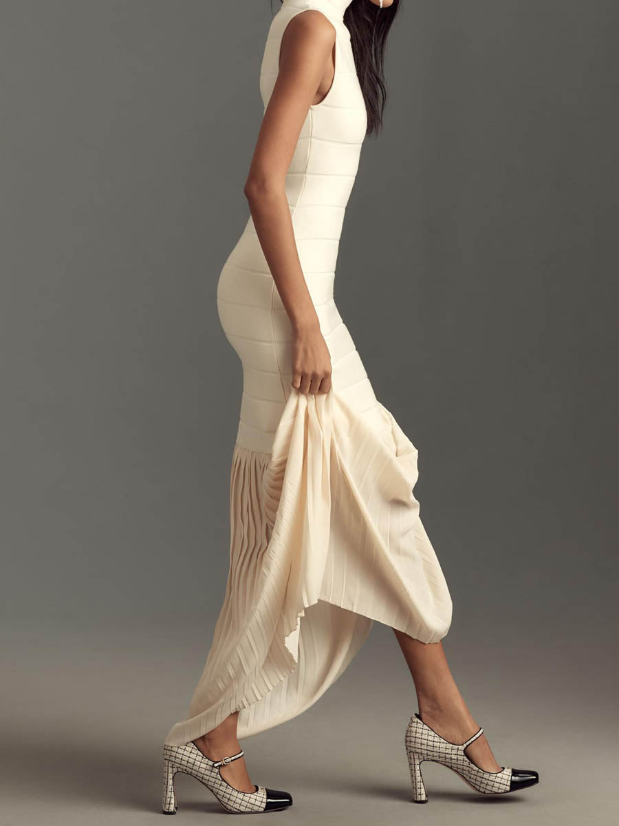 Turtleneck Pleated Patchwork Fitted Maxi Dress